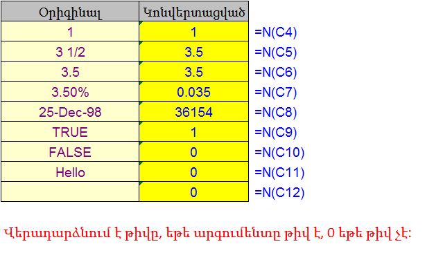 Ինֆորմացիոն դասի ֆունկցիաների շարքին է դասվում նաև N ֆունկցիան: Այն ունի 1 արգումենտ: Ֆունկցիան կոնվերտացնում է արգումենտը թվի, իսկ եթե արգումենտը թիվ չէ, ապա 0-ի: Օրինակների շարքը տեսե’ք ստորև`