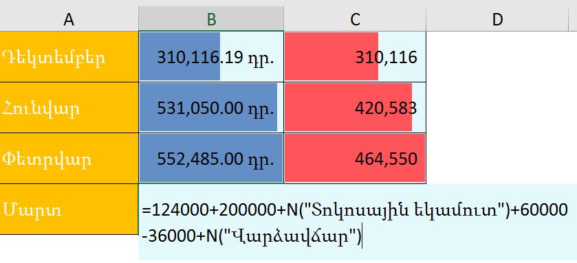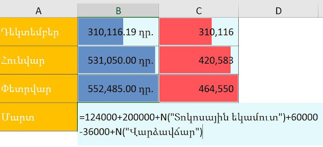 Քանի որ ֆունկցիայի արգումենտում տեքստ է /մեկնաբանություն/, այն կվերադարձնի 0, ինչն էլ ոչ մի կերպ չի ազդի արդյունքի վրա: Մեկնաբանությունները դիտելու համար կարելի է կանգնել վանդակի վրա. դրանք, ֆորմուլայի հետ միասին, կերևան ֆորմուլաների դաշտում: